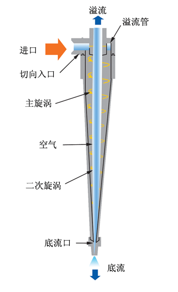 旋流分離器的基本構造為一個圓錐形腔體,有一個切向進口和兩個軸向出口。它是一種 離心沉降原理將非均相體系中具有不同密度的相分離的機械分離設備。油水混合液用泵從切向進口注入旋流分離器,從而在旋流分離器內高速旋轉,產生離心力場。在這離心力的作用下,密度大的相——水被甩向四周,并順著壁面向下運動,作為底流排出;密度小的相——油被帶到中間并向上以內動,最后作為溢流排出。這樣,用旋流分離器就達到油水分離的目的。